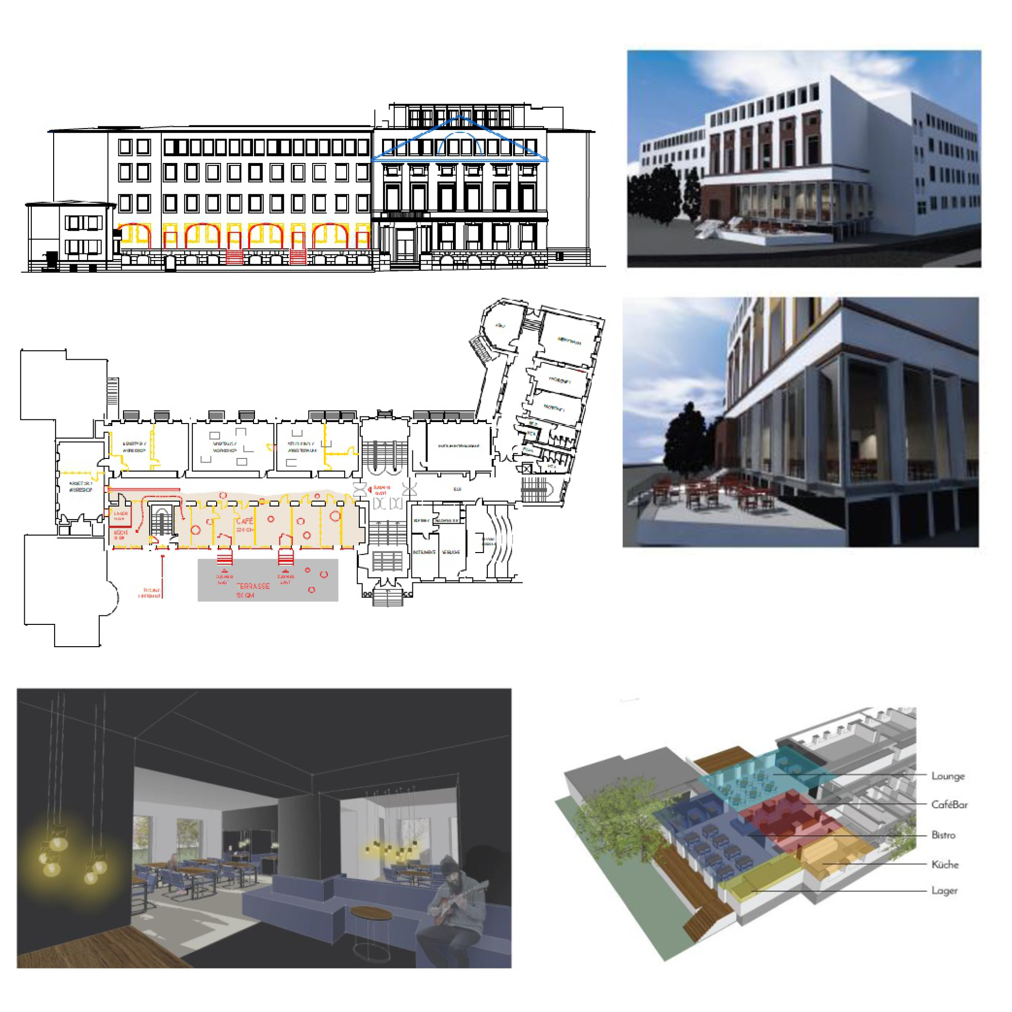 Insgesamt wurden Mitte November 2018 insgesamt 62 Beiträge mit unterschiedlichsten Konzepten eingereicht. Die Schwierigkeit bestand nicht nur darin, das Café möglichst adressbildend, weithin sichtbar und gut erreichbar zu platzieren, sondern auch die funktionalen Zusammenhänge der angrenzenden Lehrräume zu lösen. Nicht zuletzt sollte auch ein innenräumlich attraktives Café ausgestattet werden, das den Anforderungen der Studierenden gerecht wird und für externe Besuchende einladend wirkt.
